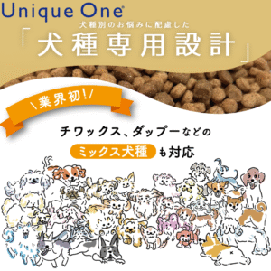 「Unique One(ユニークワン)」は、犬の「遺伝子・腸内フローラ研究」をもとに、それぞれのケアポイントを栄養学的にサポートするように、獣医師監修のもとに作られたフードです。