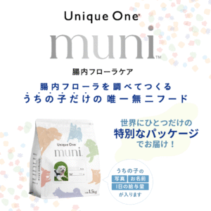 ◆「Unique One muni」は、ワンちゃんの腸内フローラを調べ、腸内フローラ検査の結果を基に、年齢、体重などを考慮しながら、個々に必要な成分を特別配合して作られる【うちの子だけの唯一無二のオーダーメイドフード】です。